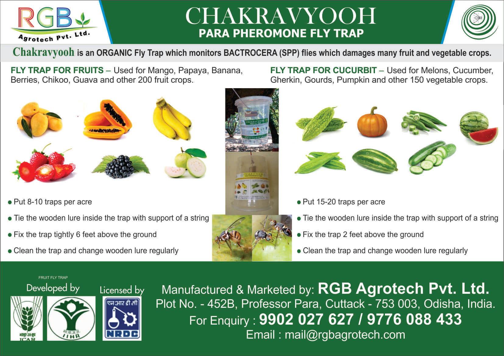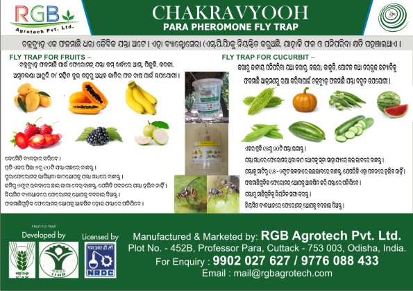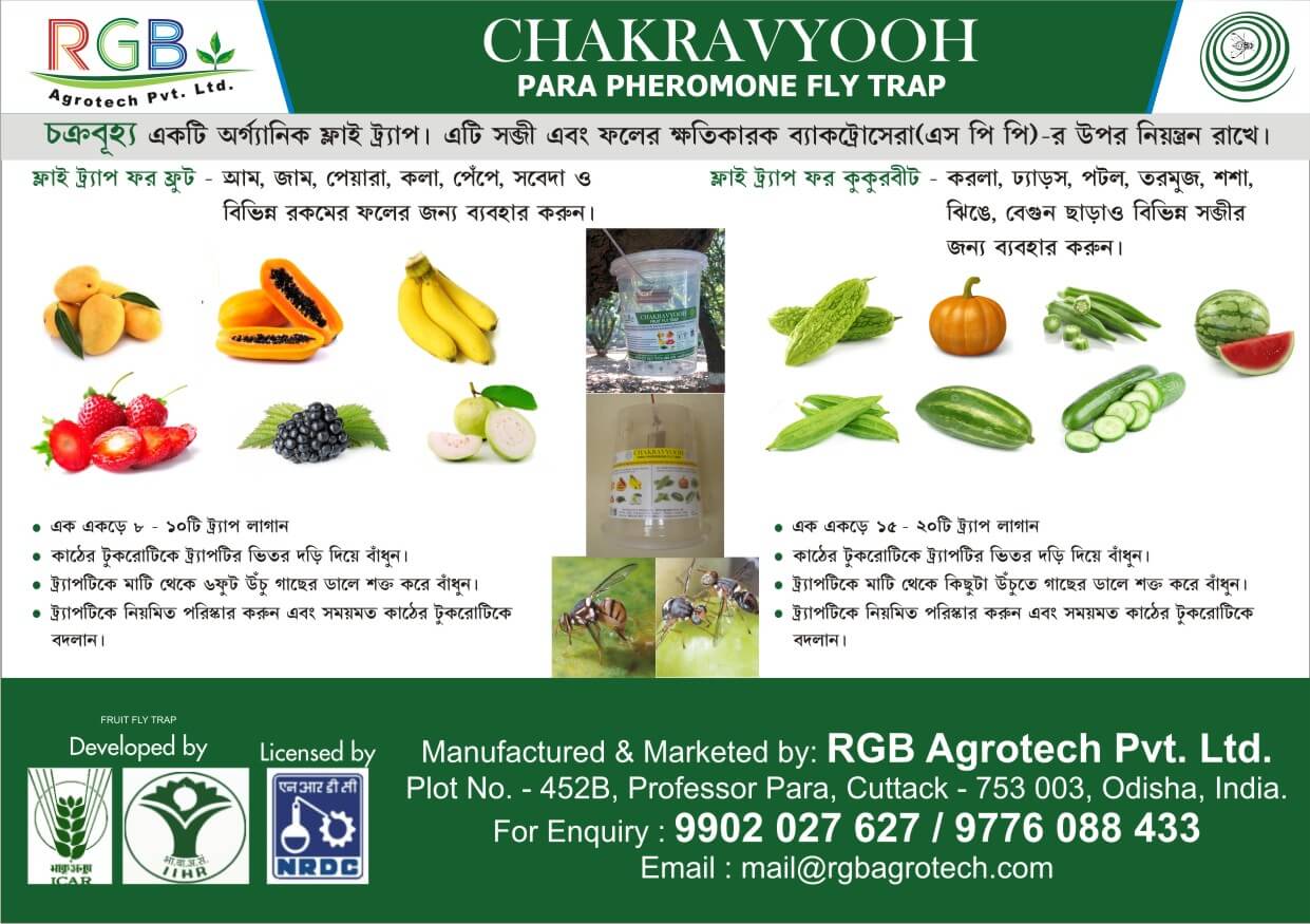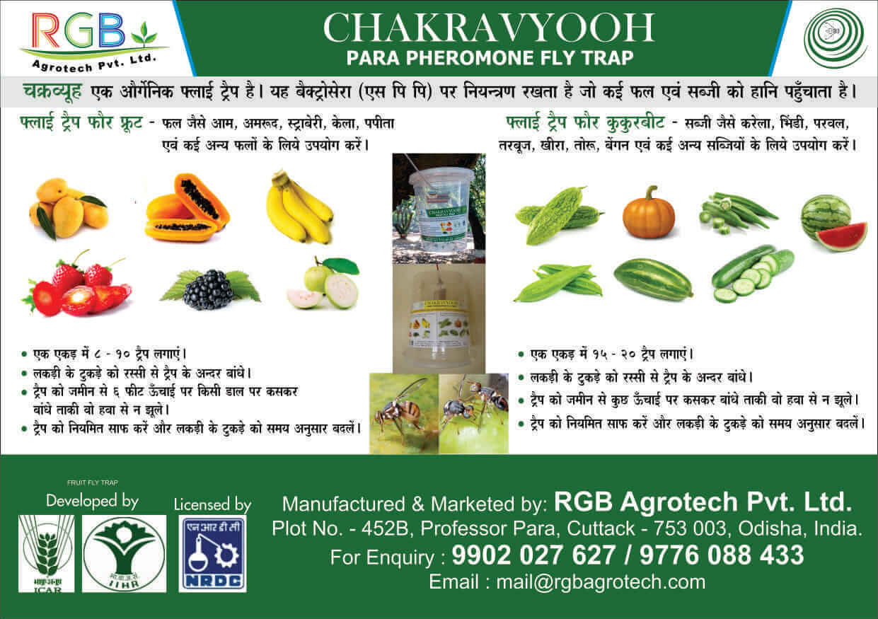 An non toxic plastic box are made. A wooden lure with special chemical applied on it is placed inside the box. The chemical attracts over 95% of MALE flies. 15 -20 such traps are required to be placed strategically in 1 acre of land.